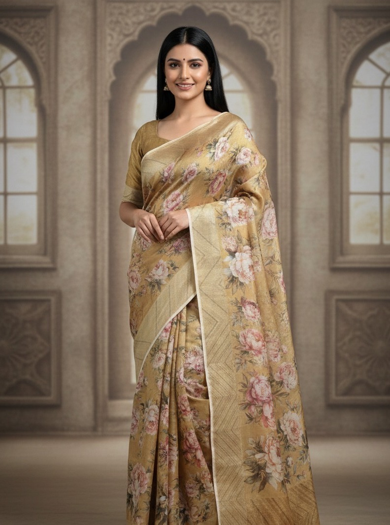 A warm Golden mustard tone gives this Art Handloom Digital Print Saree a rich and graceful character. The fabric carries a soft, natural texture that feels light and comfortable throughout the day. Digital floral motifs spread across the body, adding a gentle decorative touch without overpowering the base shade.