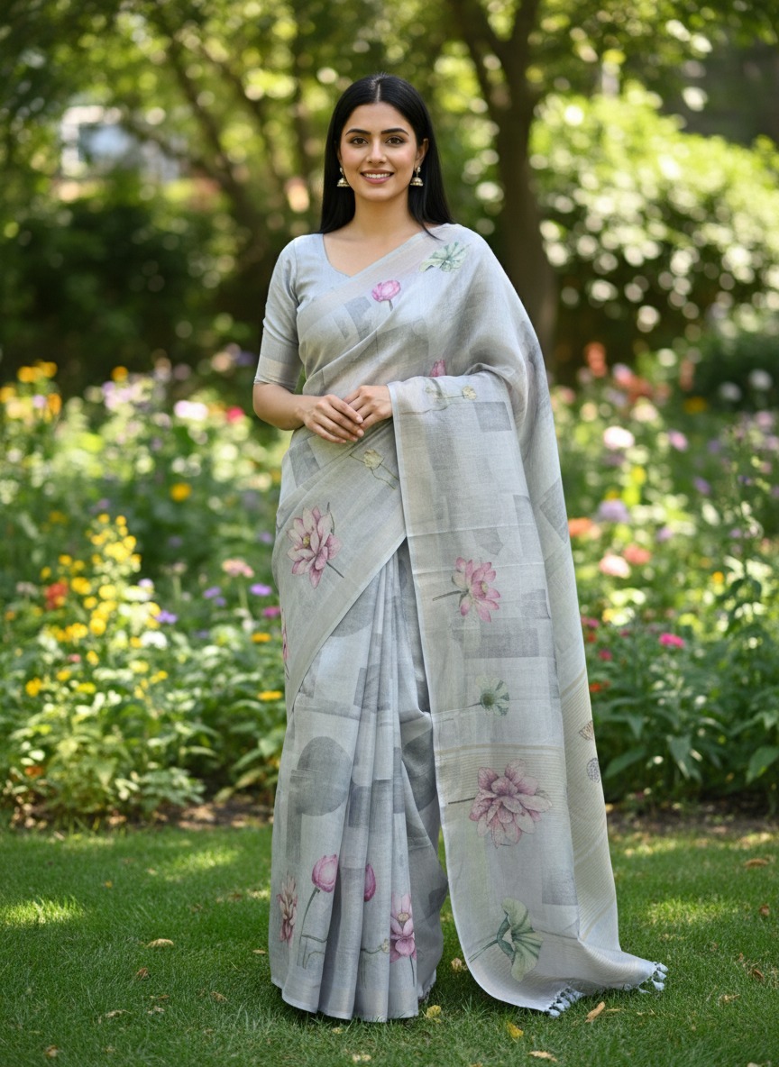 Soft grey shades create a calm and elegant base for this Art Handloom Digital Print Saree. The fabric feels light on the skin and drapes naturally, offering all-day comfort. Fine floral digital prints bloom across the body, adding a gentle decorative touch while keeping the look modern and refined.