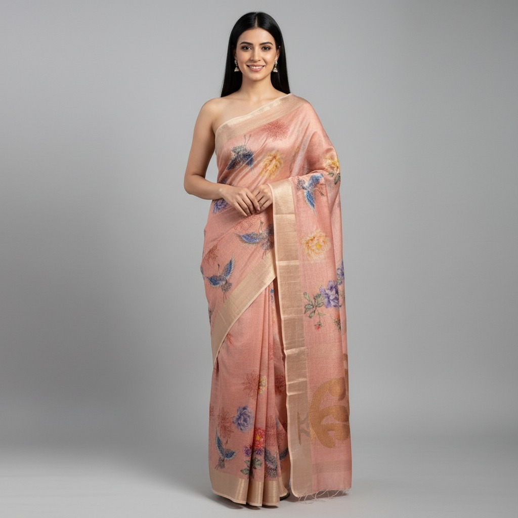 A gentle blend of craft and creativity brings this saree to life. The Art Dupion fabric offers a smooth, airy hand feel, making the drape effortless and comfortable for long hours. Digital floral artwork flows across the body, adding a modern softness without overpowering the look.